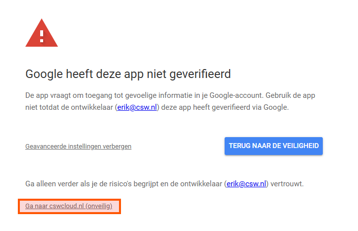 Daar kan je dan op Geavanceerd klikken en op Ga naar cswcloud.nl