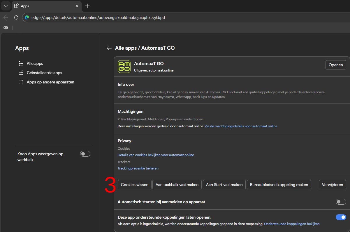 Klik op 'Cookies wissen', sluit daarna de app af en start hem opnieuw