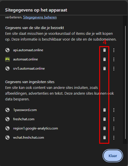 6. Verwijder de cookies door achter de regel op het prullenbakje te klikken